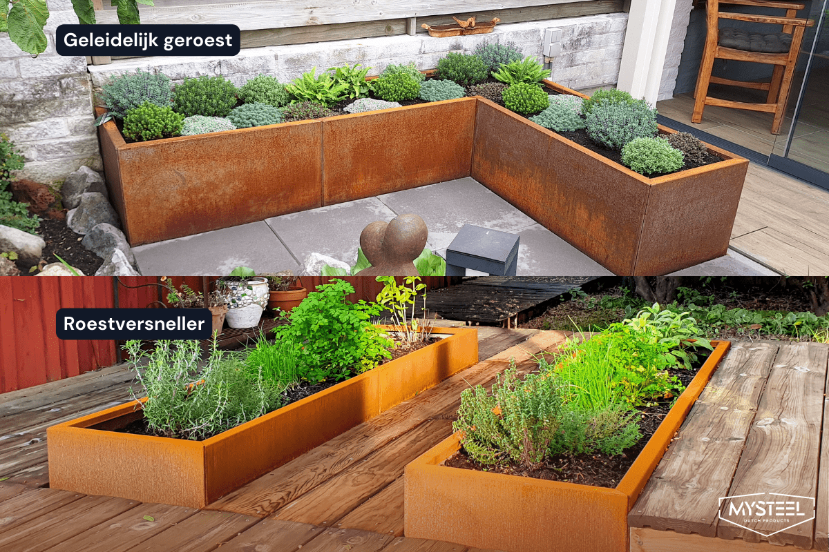 Wenn Sie trotzdem ein echtes Gartenprodukt aus Cortenstahl bevorzugen, aber nicht auf den natürlichen Rostprozess warten wollen, können Sie auch unseren Rostbeschleuniger kaufen. Dieser Rostbeschleuniger wurde speziell entwickelt, um den Rostprozess zu beschleunigen. Wenn Sie den Rostbeschleuniger gleichmäßig auf Ihr Cortenstahlprodukt auftragen, können Sie das warme, rostige Aussehen schneller genießen. Der Rostbeschleuniger ist sowohl für den Cortenstahl als auch für die Umwelt völlig ungefährlich.