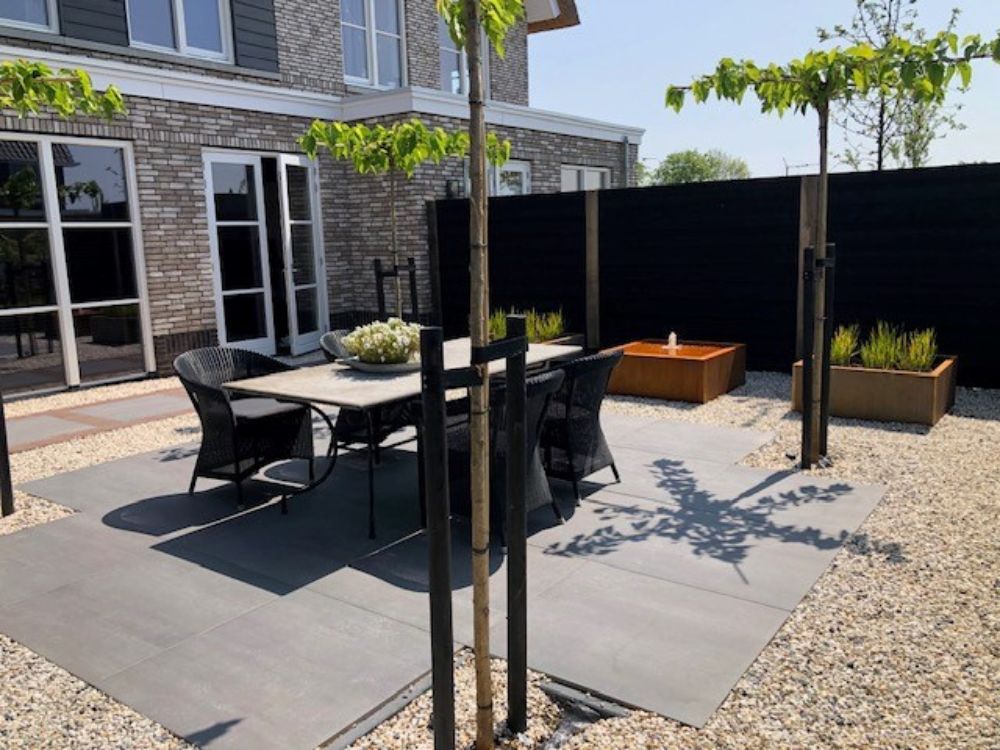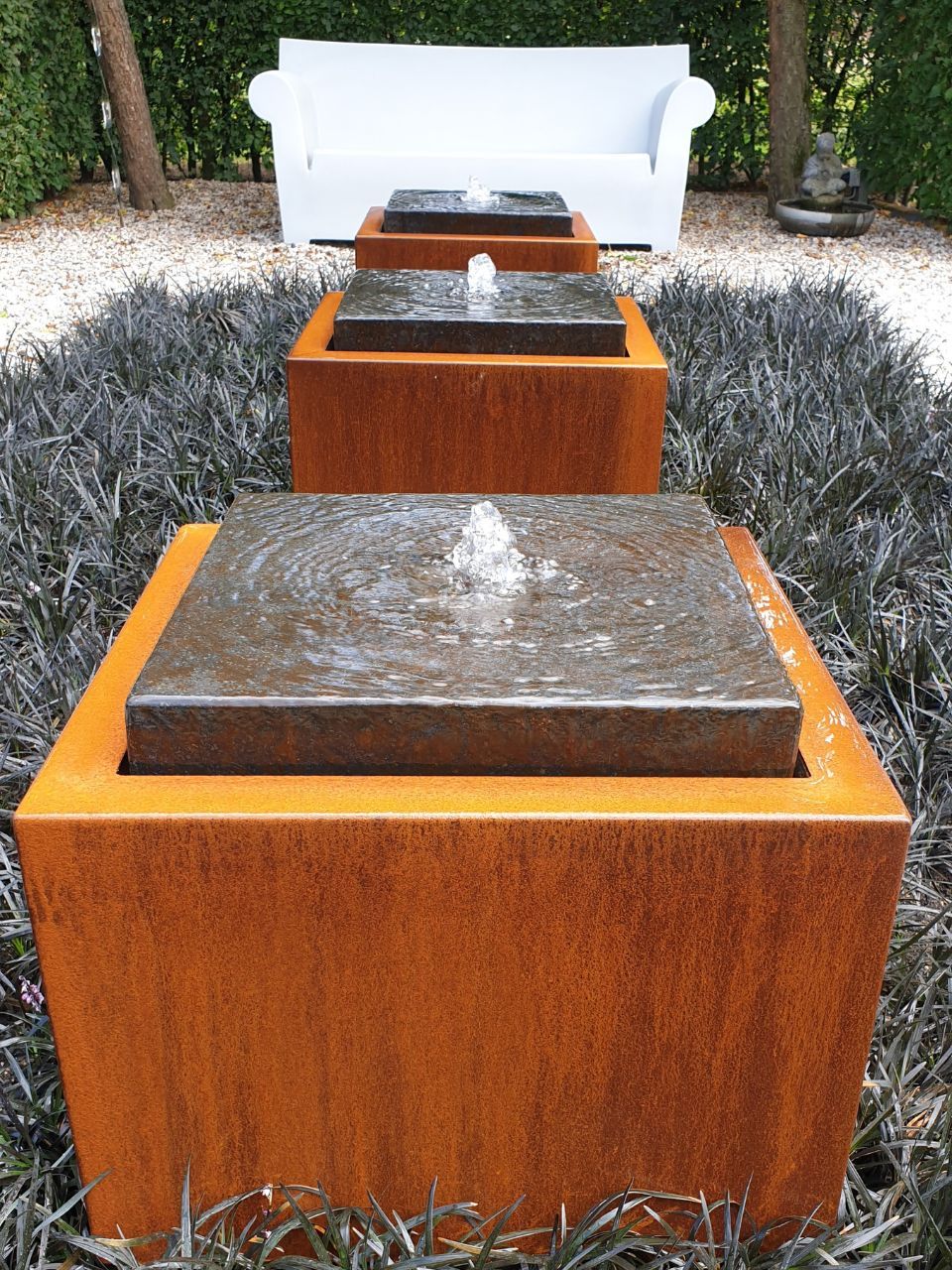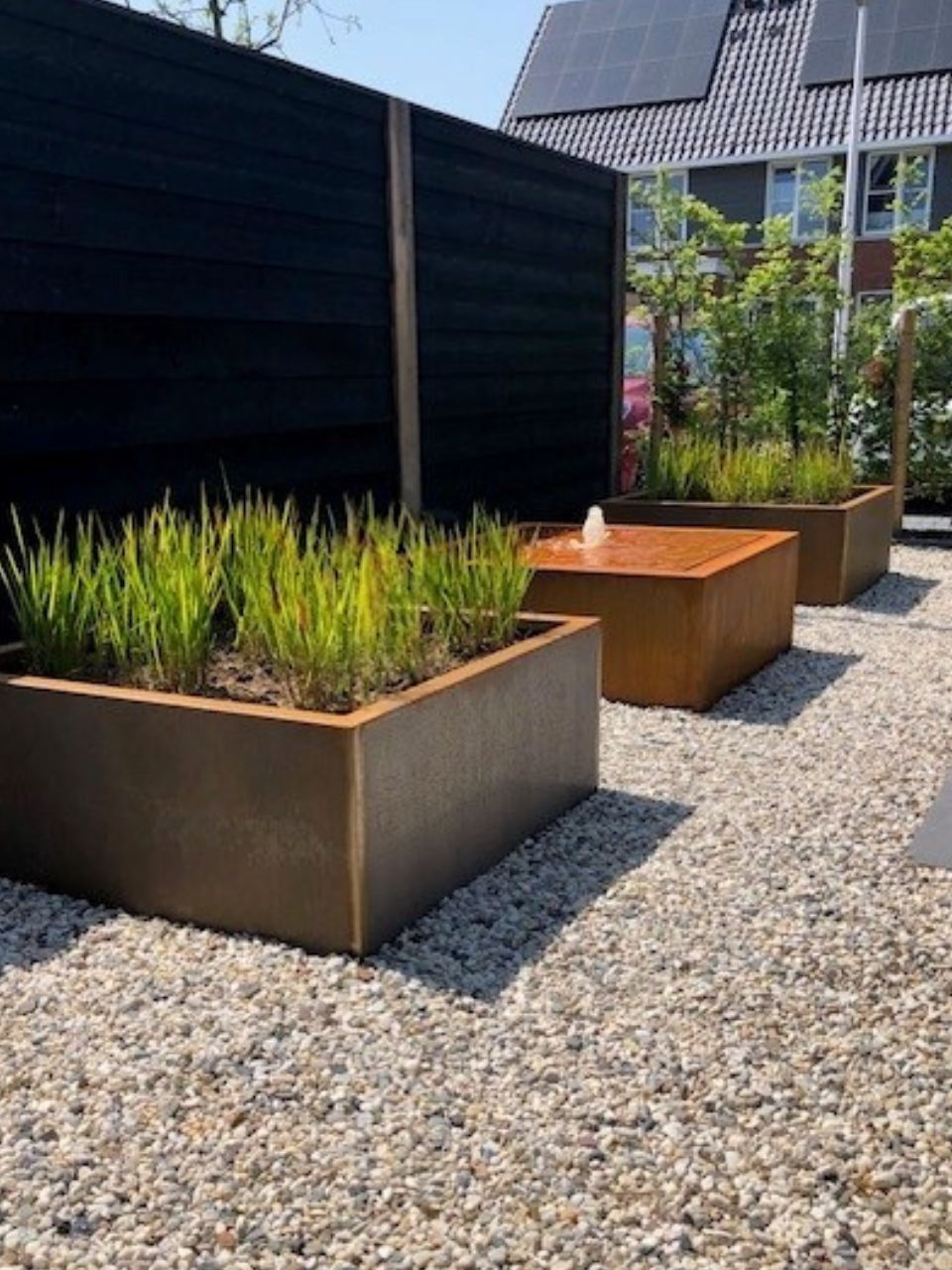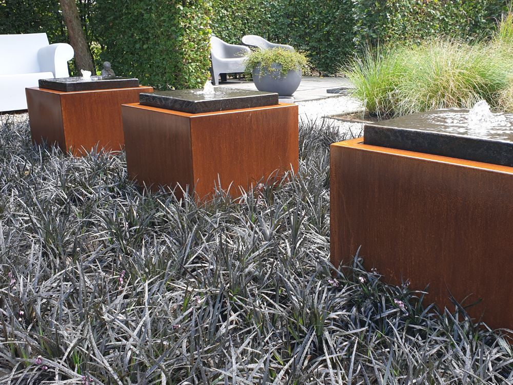 - Wassertische und -einfassungen aus Cortenstahl verleihen ein modernes Aussehen.