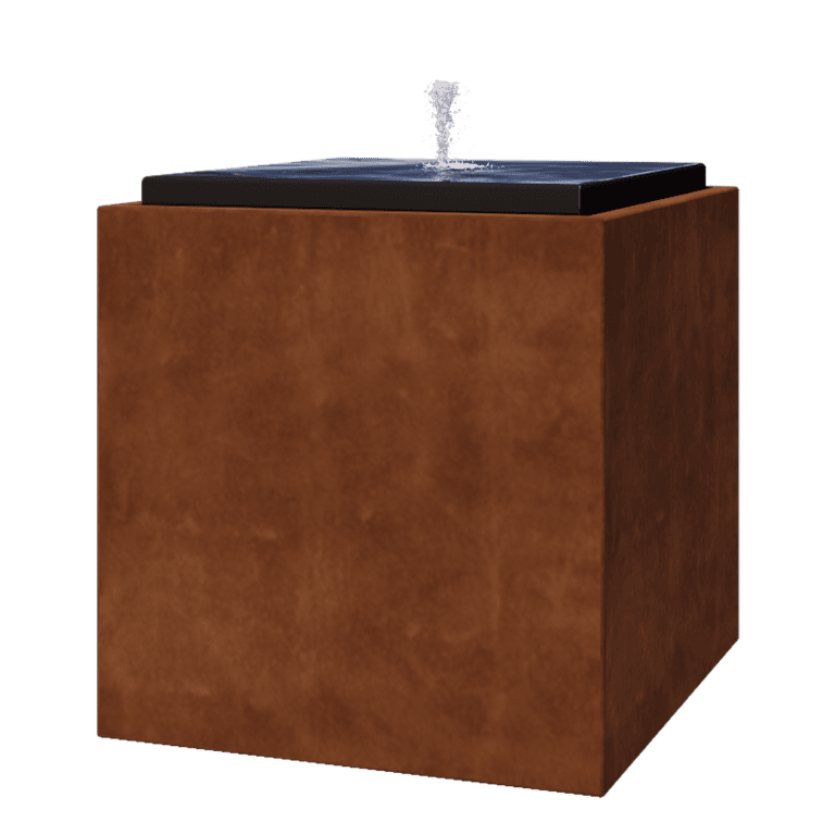 Das Wasserornament wird komplett mit einer passenden Pumpe mit Kabel geliefert. Die Pumpe im Inneren des Beckens pumpt das Wasser nach oben. Das Wasser läuft dann über die innere Platte, bevor es zurück in die Schale fällt. In den ersten Monaten müssen Sie das Wasser in einem Wasserschmuck aus Cortenstahl wechseln, bis der Rost vollständig abgebaut ist. Bei Frost sollte die Pumpe abgeschaltet werden. Als zusätzliche Option können Sie sich für eine LED-Beleuchtung entscheiden.